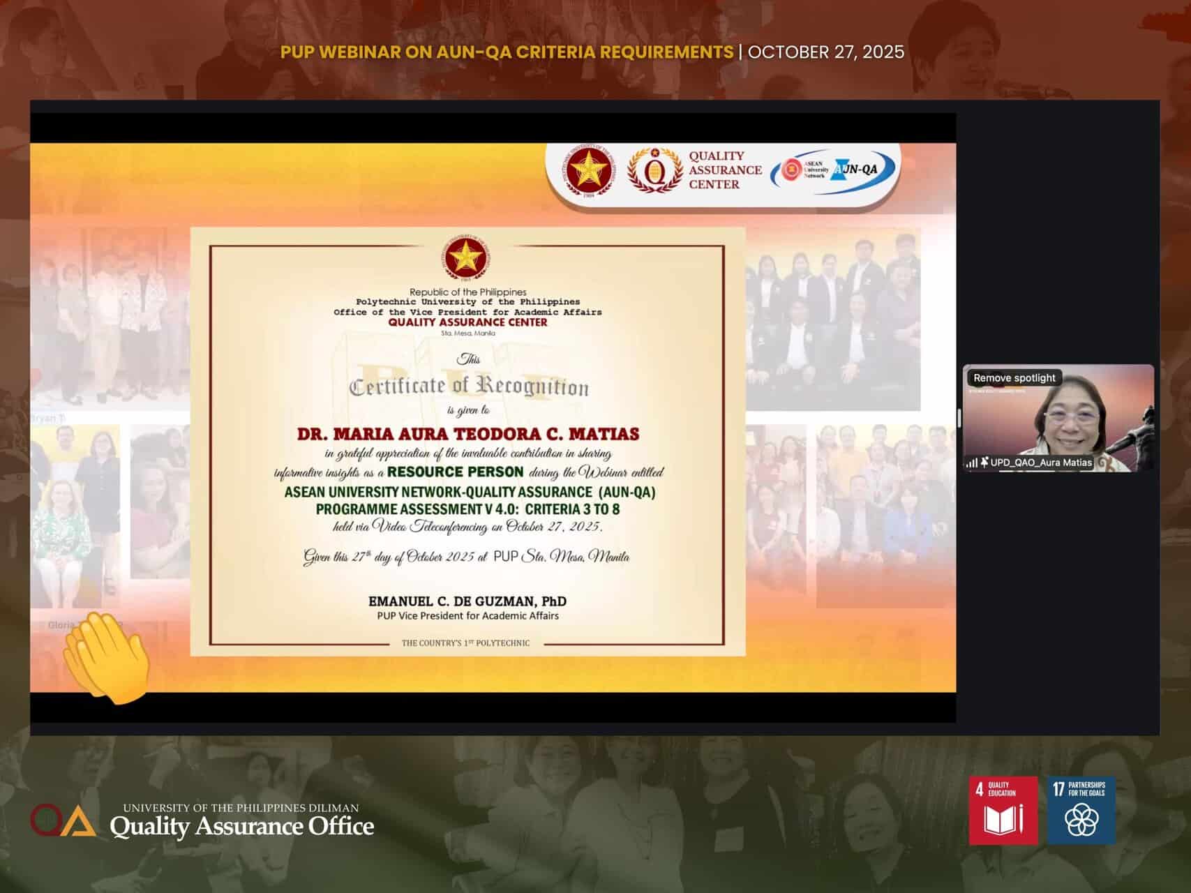 As a follow-up to the benchmarking activity last year by the Polytechnic University of the Philippines (PUP) with UP Diliman (UPD) academic units, another collaboration was held between the UPD Quality Assurance Office (UPD QAO) and the PUP Quality Assurance Center (PUP QAC), this time through a webinar on the ASEAN University Network – Quality Assurance (AUN-QA) Programme-level Assessment Requirements, focusing on Criteria 3 to 8 last October 27, 2025.