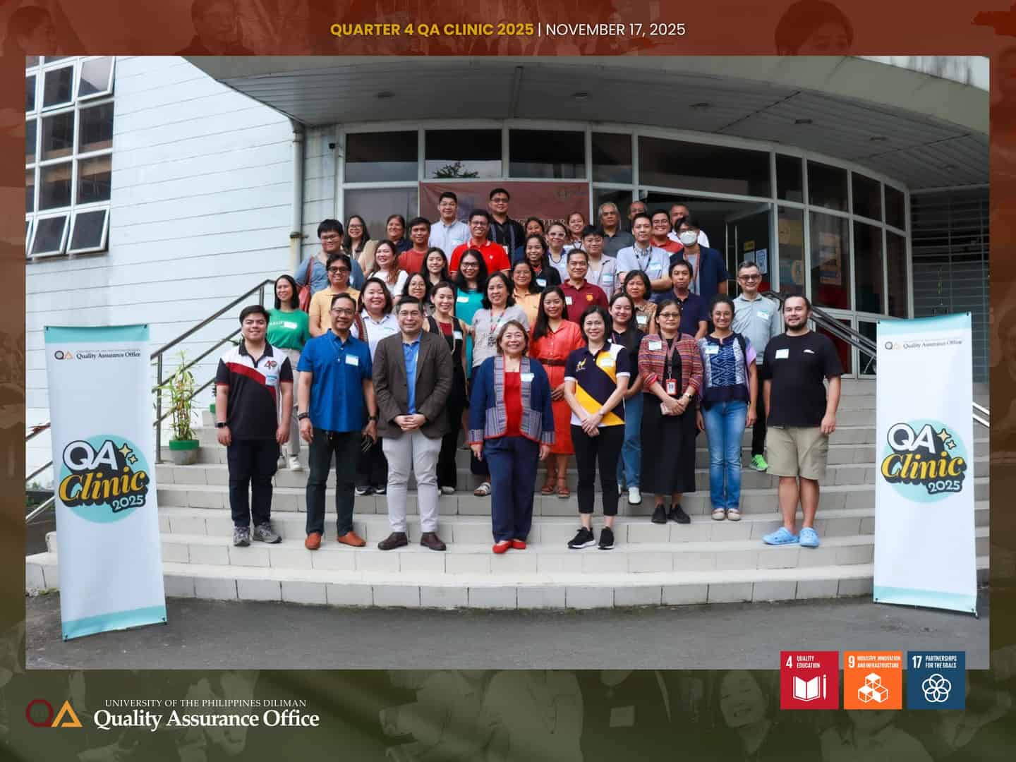 The UP Diliman Quality Assurance Office culminates its Internal Quality Assurance activities with its Quarter 4 QA Clinic, bringing together 42 participants across 29 degree-granting units (DGUs). Held on November 17, 2025 at the UP Diliman Electrical and Electronics Engineering Institute (EEEI), the QA Clinic was attended by academic unit heads, faculty members, research and administrative staff, and QA officers across the academic clusters.