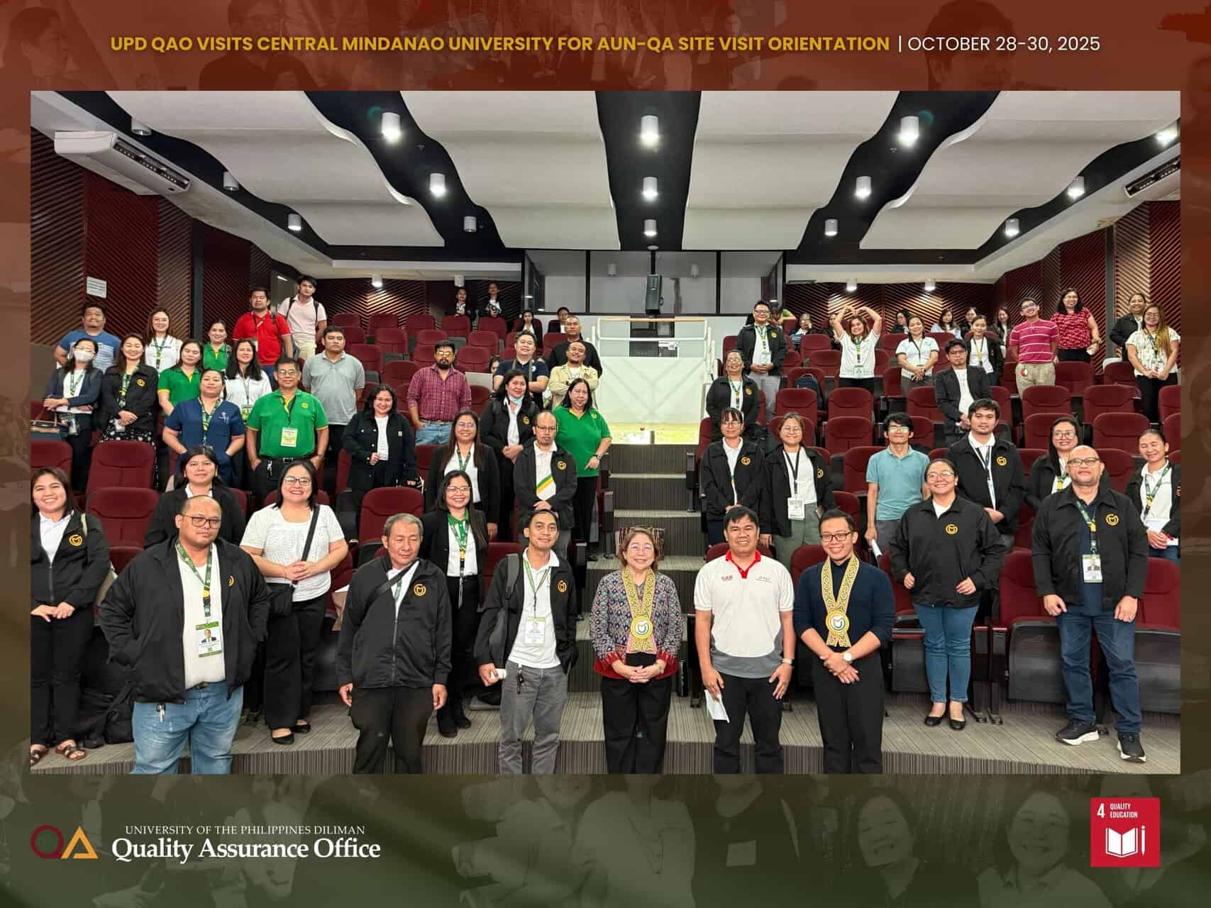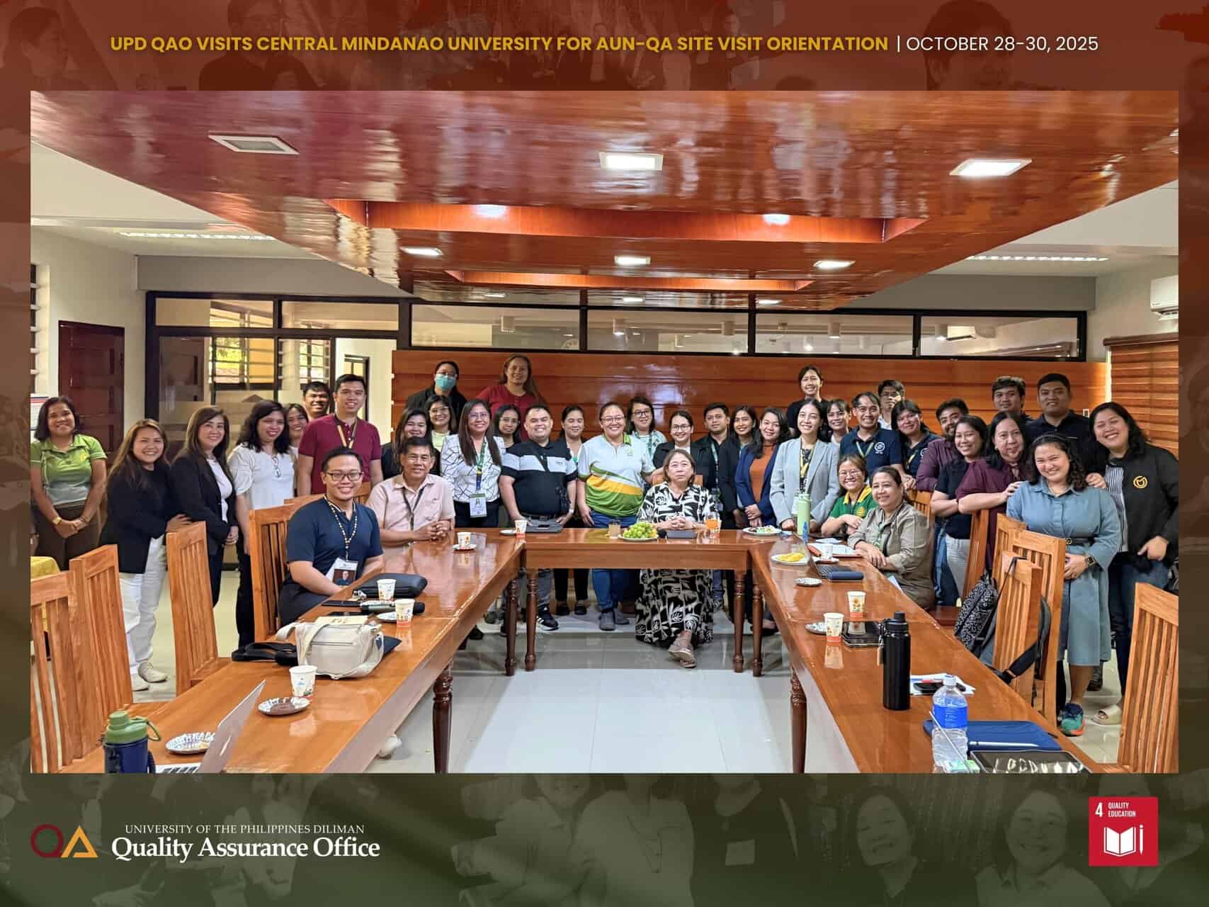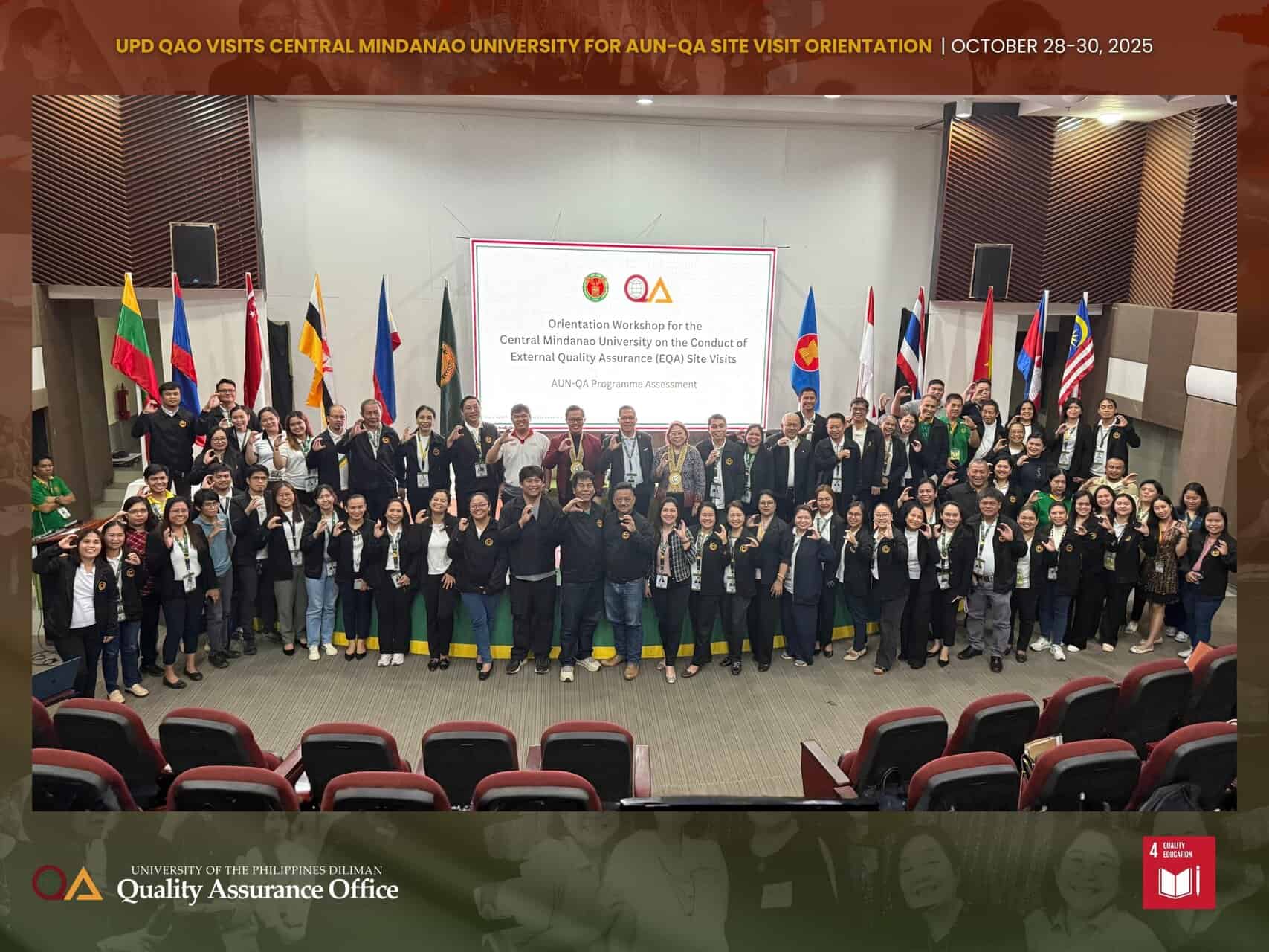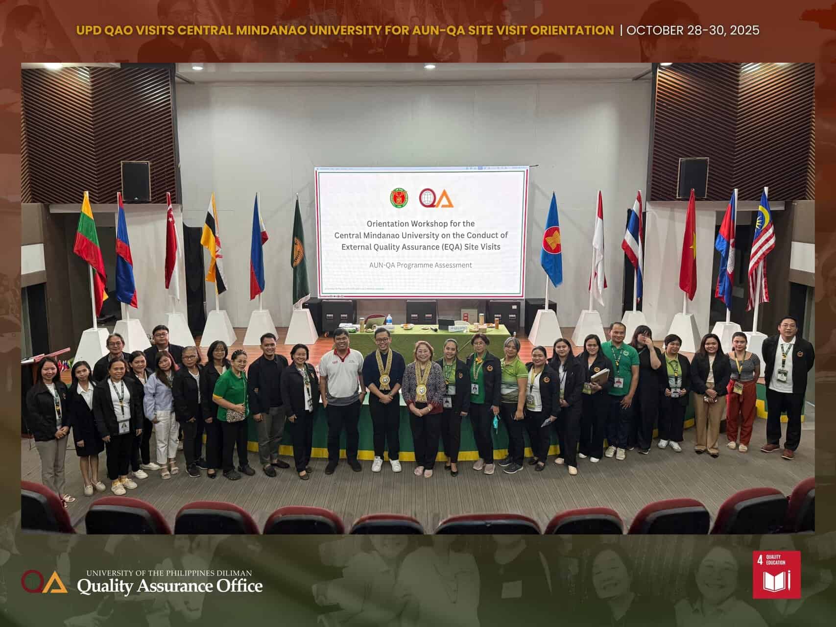 Dr. Maria Aura Teodora C. Matias, Director of the UP Diliman Quality Assurance Office, was invited by the Office of Quality Assurance (OQA) of the Central Mindanao University to orient specific stakeholder groups about the conduct of assessment site visits, specifically in the format of the ASEAN University Network-Quality Assurance (AUN-QA). The orientation workshop was conducted last October 28-30, 2025, and was attended by administrators at the university-, college-, and department-levels, faculty members, support staff, and the administrators and staff of the OQA. Director Matias is joined by Mr. Charles Ramos.