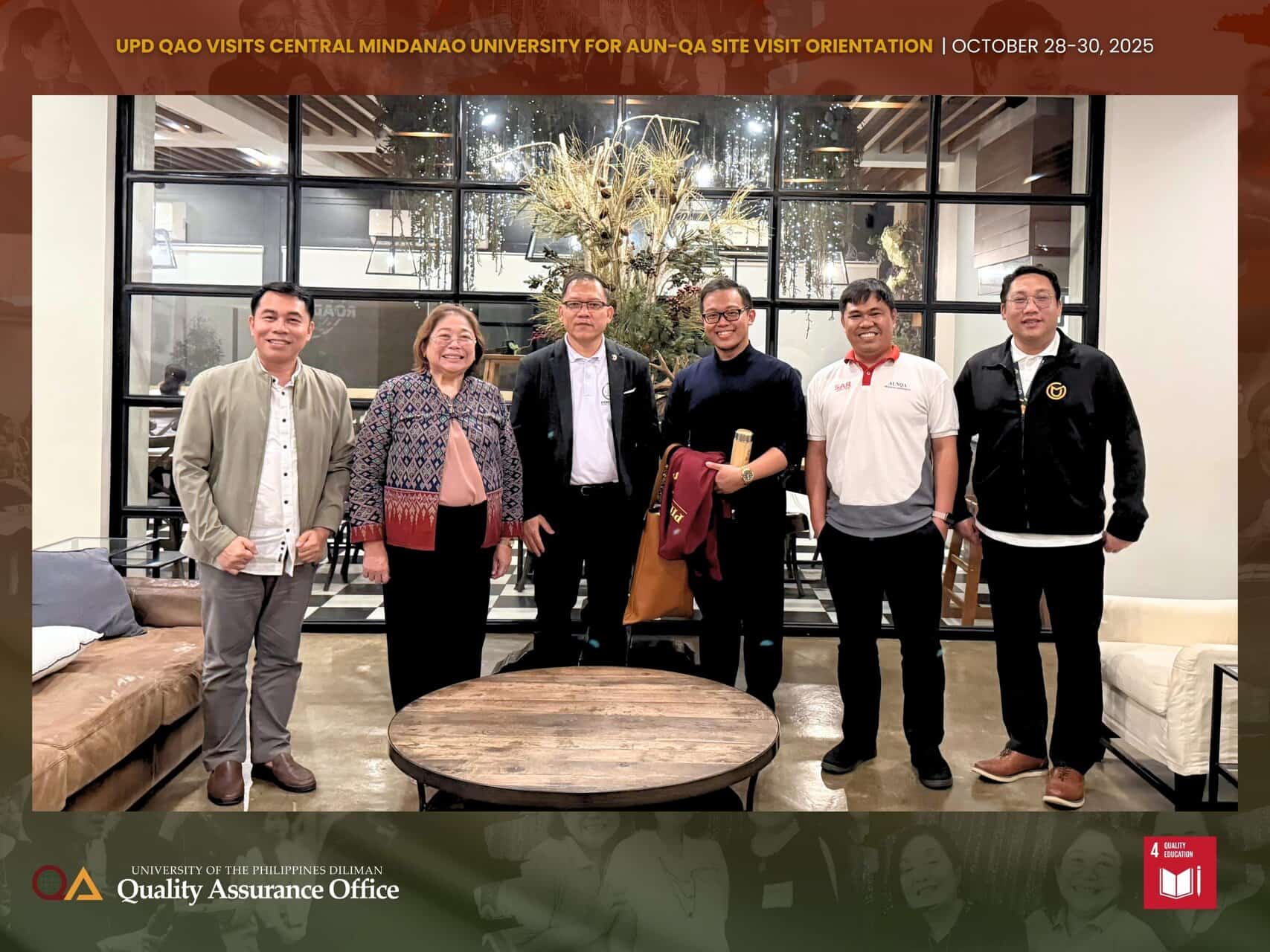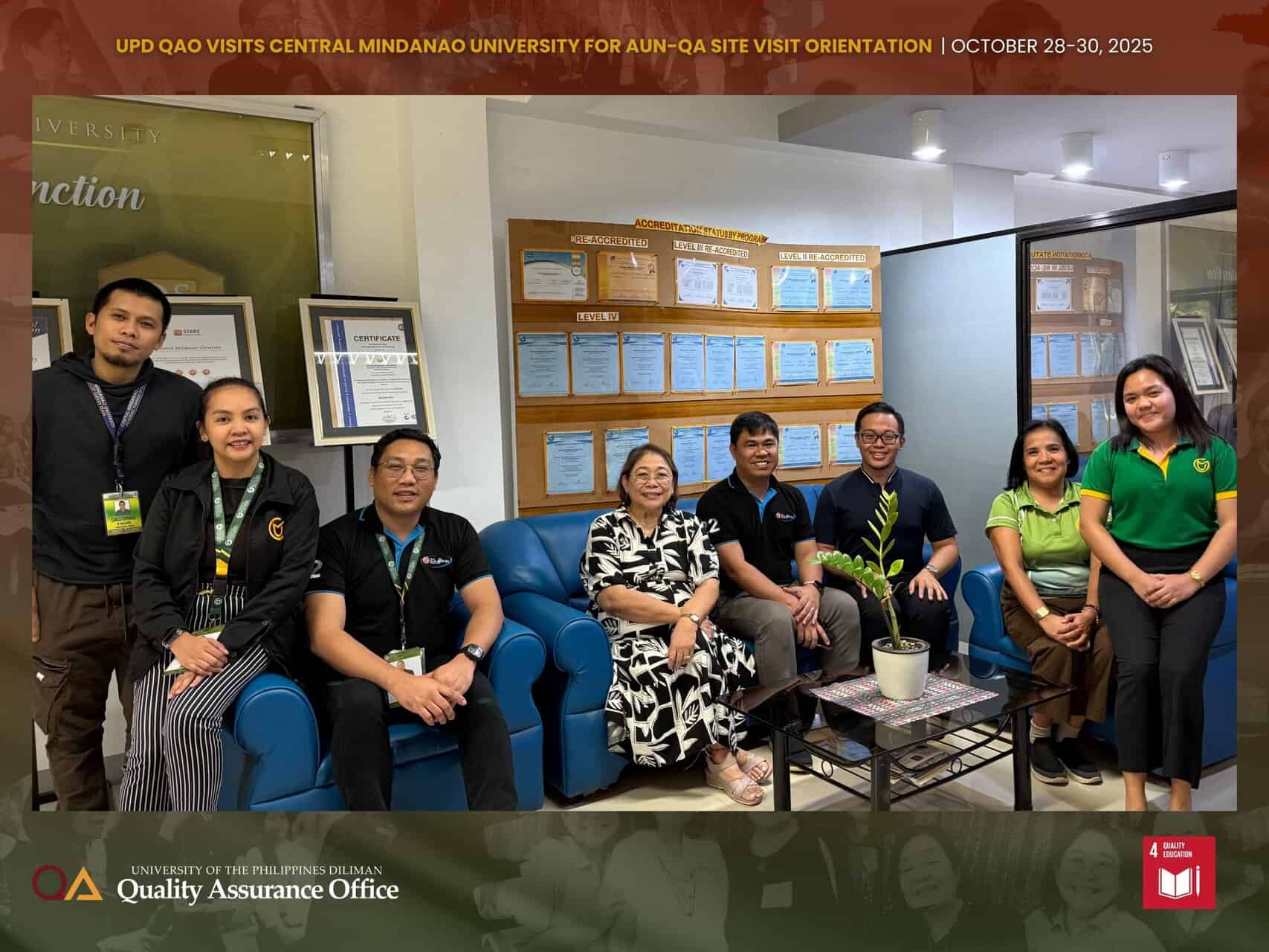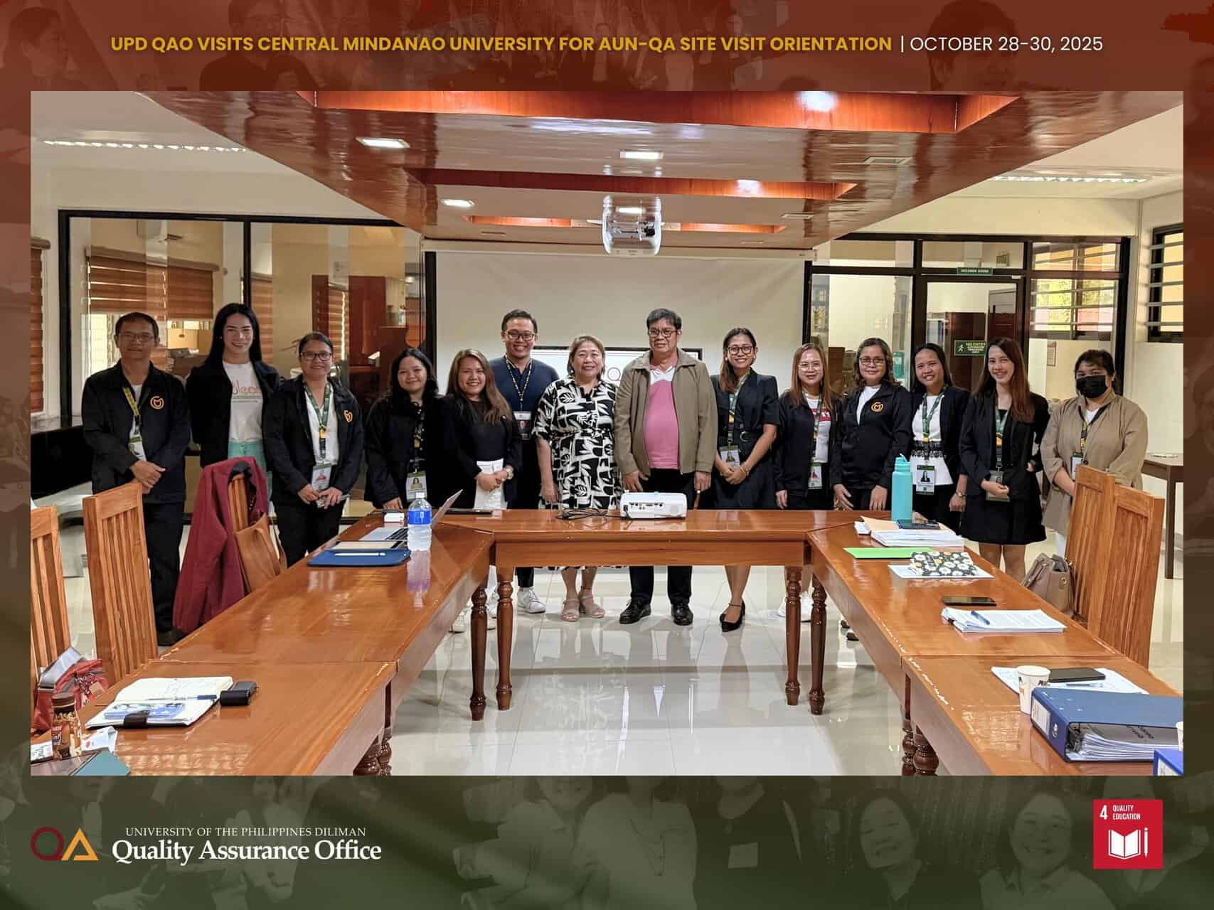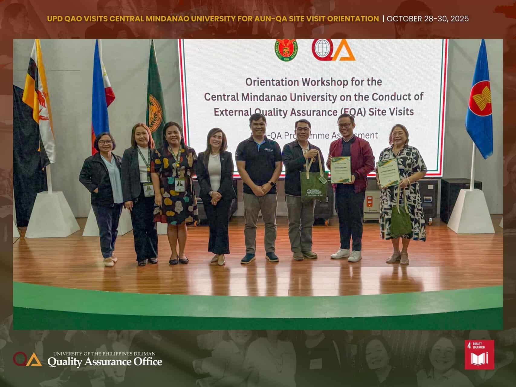 Dr. Maria Aura Teodora C. Matias, Director of the UP Diliman Quality Assurance Office, was invited by the Office of Quality Assurance (OQA) of the Central Mindanao University to orient specific stakeholder groups about the conduct of assessment site visits, specifically in the format of the ASEAN University Network-Quality Assurance (AUN-QA). The orientation workshop was conducted last October 28-30, 2025, and was attended by administrators at the university-, college-, and department-levels, faculty members, support staff, and the administrators and staff of the OQA. Director Matias is joined by Mr. Charles Ramos.