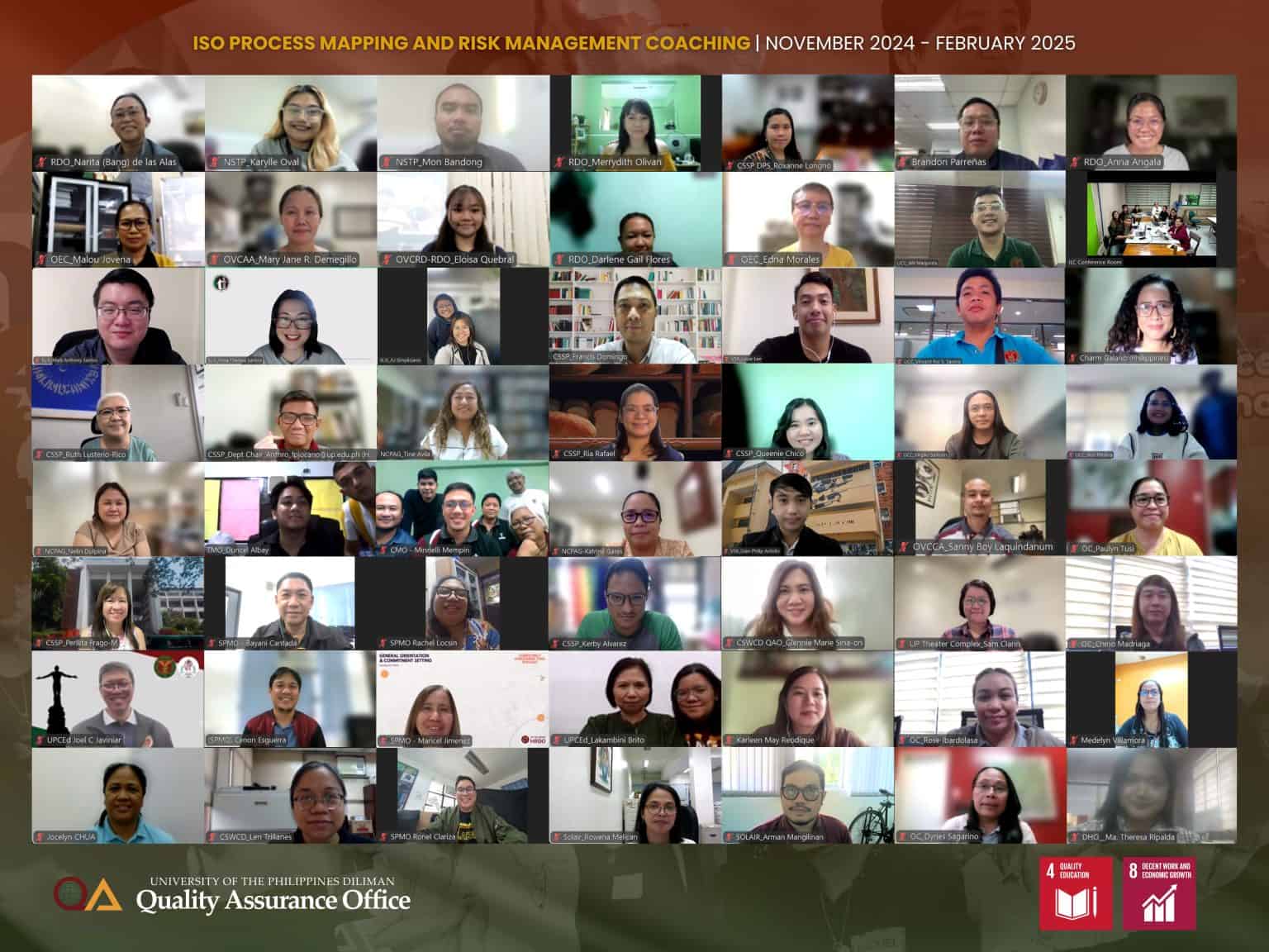 To reinforce the foundational knowledge gained from the series of onsite training for the Phase 1 of the ISO 21001:2018 EOMS Certification Project, the UP Diliman Quality Assurance Office (UPD QAO) successfully conducted multiple sessions of Process Mapping and Risk Management Coaching from November 2024 to February 2025.